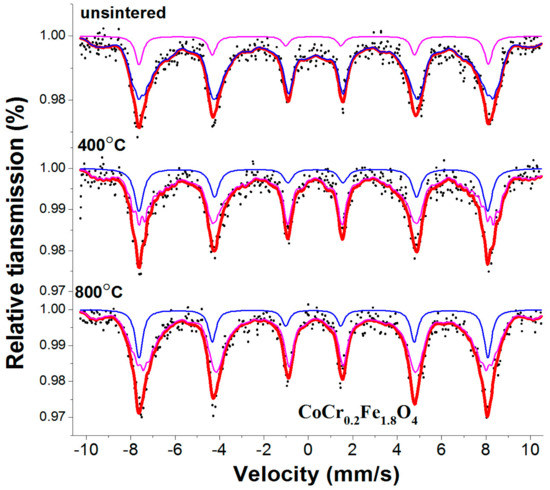 Room temperature Mössbauer spectra for CoCr0.2Fe1.8O4 calcined at different temperatures.