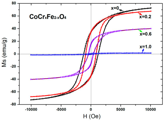 The magnetic hysteresis loops for CoCrxFe2−xO4 at room temperature are shown in Figure 7. For all samples, magnetization reached saturation at a magnetic field of 10,000 Oe. It can be observed from Table 5 that the saturation magnetization of the sample decreases with the substitution of chromium ions. The saturation magnetization of the sample is expressed as the following relationship [5]: