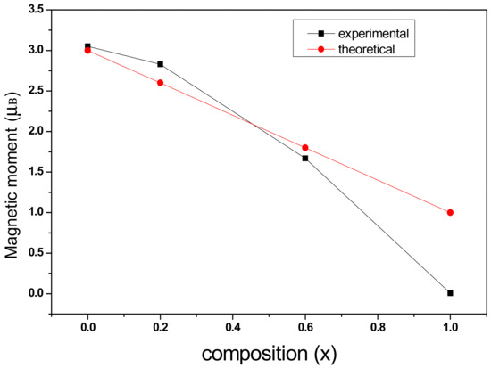 As can be seen from Figure 8, the experimental magnetic moment and the theoretical magnetic moment decreases as the Cr content, x, increases, and according to the relationship (2), the theoretical saturation magnetization decreases with increasing chromium concentration. The saturation magnetization obtained by the experiment is in accordance with the theoretical analysis for all samples.