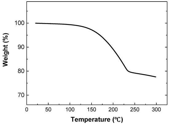 A Cu paste with nano-sized Cu powders was successfully fabricated. To investigate the thermal property of the fabricated Cu paste, we performed the TGA analysis. Figure 4 shows the TGA analysis result. From the TGA result in the temperature range of 25~300 °C, we confirmed that the weight loss of the Cu paste started at around 150 °C and completed at around 225 °C. These weight losses were related to the evaporation of solvent during heating. After heating up to 300 °C, approximately 78 wt % Cu remained. This content was well matched to the Cu metal content used in the Cu paste fabrication.