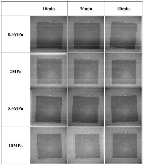 The Cu-sintering process was conducted under various sintering conditions. X-ray inspections were performed to observe areas with no bonds and defects such as voids at the Cu-sintered interfaces. Figure 5 shows the X-ray observation images of the Cu-sintered joints at 300 °C under various sintering conditions. There were no big differences between black and white contrasts in the X-ray images. In other words, the uniform levels of the X-ray images suggest that the sintered Cu joints do not have relatively large voids. From the results of the X-ray inspection, it was confirmed that the Cu-sintered joints were fabricated and bonded well, and that there were no distinguishable defects at the interfaces, regardless of the different sintering conditions.
