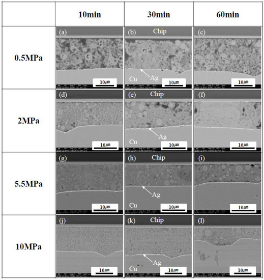 Figure 6 shows the cross-sectional SEM images of the Ag-finished Si chip/sintered Cu layer/DBC joints at different sintering pressures and times at 300 °C. Although large defects or voids were not observed during the inspection of the X-ray, the sinter joints bonded at a low bonding pressure of 0.5 MPa had relatively loose Cu-sintered layers, and sufficient sinter bonding reactions between Cu particles and/or chip/DBC metal layers had not occurred during the sintering process, as shown in Figure 6a–c. In the case of a relatively low bonding pressure of 0.5 MPa, enough contacts between Cu particles and chip or DBC metal layers did not occur, which resulted in the formation of relatively loose Cu-sintered joints. As the sintering pressure was increased to 2 MPa (Figure 6d–f), the sinter bonding effectively occurred at both interfaces, and the Cu-sintered layer satisfactory adhered to both the Ag finish layers of the Si chip and the DBC substrate. As the sintering pressure increased up to 5.5 and 10 MPa, more stable interfacial microstructures and relatively dense sintered layers were observed in the Cu-sintered joints, as shown in Figure 6g–l. The presence of good interfacial uniformity and metallurgically stable interfacial microstructures observed in the Cu joints sintered at a high bonding pressure of 10 MPa (regardless of the sintering duration) was confirmed. Despite a short sinter-bonding duration of 10 min, a good Cu-sintered joint can be obtained, as shown in Figure 6j. The applied sintering pressure increased the events of contacts between Cu nanoparticles, resulting in increase of sinter-bonding rate and decrease of voids and loose microstructures.