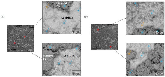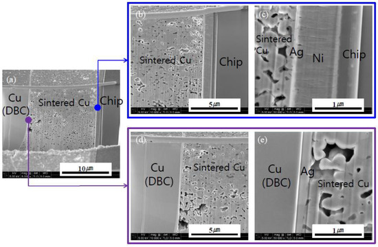FIB analyses were performed to observe the interfacial microstructures of the Cu-sintered sample shown in Figure 6j, whose results can be seen in Figure 7. The Cu-sintered layer between the chip and DBC substrate was clearly observed, and good metallurgical bonding between the Cu particles and Ag layers of both chip and DBC substrates was confirmed at both interfaces. We confirmed the presence of relatively white thin Ag coating layers between sintered Cu and chip or DBC substrate. According to previous literatures [20,25], good metallic bonding occurs at the Ag/Cu interface during sintering. Cu and Ag have the same face-centered-cubic (FCC) crystal structure, and their binary system forms complete solid solutions. They also do not form any intermetallic compounds, and atomic inter-diffusion occurs easily without any significant lattice distortion. Consequently, inter-diffusion occurs between the Cu particles and Ag surface finishes of both chip and DBC substrates during the sintering process, which resulted in relatively good Cu-sintered joints under a bonding pressure of 10 MPa. Some micro-sized sintering voids were also observed in the Cu-sintered joint.