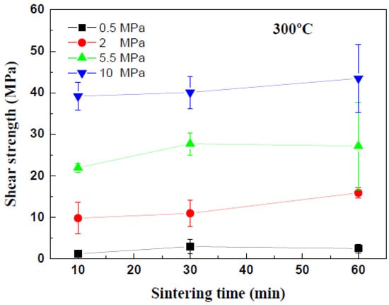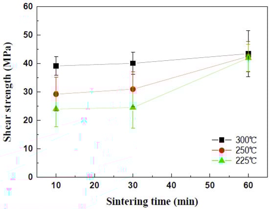Die shear tests were performed to evaluate the effects of the sintering temperatures on the mechanical strengths of the Cu-sintered joints, whose results can be seen in Figure 12. In the case of sintering duration for 10 min, the shear strength of the Cu-sintered joints increased with an increase in sintering temperature. The die shear strengths of the Cu-sintered joints at temperatures of 225, 250, and 300 °C were approximately 25, 30, and 40 MPa, respectively. These values do not significantly increase with an increase in sintering duration for up to 30 min, regardless of sintering temperature. Even after the sintering time expanded from 10 min to 30 min, the overall shear strengths remain constant regardless of the sintering temperature. As the sintering time increases to 60 min, the shear strength of the Cu joints sintered at 225 °C and 250 °C increases to approximately 40 MPa. Interestingly, these shear strength values are similar to that at 300 °C. This implies that the sintering reactions at different temperatures have been completed and are almost saturated under these sintering conditions. In this study, the sintering durations of 10 min at 300 °C and 60 min at 225 °C and 250 °C are sufficient for complete sintering reactions between the chip and the DBC substrate. A high shear strength of approximately 40 MPa was obtained for these sintering conditions. Relatively good metallic bonding and dense sintered microstructures from a high sintering pressure of 10 MPa resulted in the high shear strength of the Cu-sintered joints. By comparing Figure 8 and Figure 12, it was concluded that the sinter bonding pressure affected the shear strengths of the Cu-sintered joints more significantly when compared to the sintering temperature.