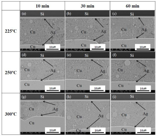 Cross-sectional SEM images of the Si chip/sintered Cu layer/DBC joints at different sintering temperatures and durations (10 MPa); (a–c) 225, (d–f) 250, and (g–i) 300 °C.