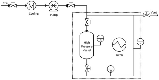 After that, the alcogels were ready to be dried with supercritical CO2. The experimental plant for aerogels drying (Figure 1) had an oven to heat the system at 45 °C, and CO2 was pumped at 110 bar above the supercritical point [20]. Inside the oven, there was a high-pressure vessel that was filled with methanol before microchannels were placed inside.
