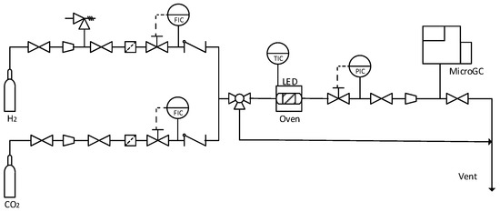 After microreactors were prepared to perform the reaction, they were carried to the experimental setup where carbon dioxide hydrogenation was performed. This plant (Figure 2) was used in previous work to test the reactor concept with good results [18].