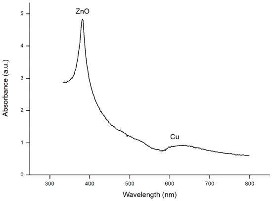 Light absorption of this bimetallic catalyst was tested by UV-Vis Spectrophotometry (Figure 5) in order to prove both materials were absorbing light in the visible band (copper) and ultraviolet band (zinc oxide). ZnO nanorods exhibited a peak at 370 nm, and Cu nanoparticles induced a peak around 600 nm, which corresponded to the absorption of the range between orange and red colour [22]. The broad definition of a peak was due to the variable size of nanoparticles, moving in a narrow range of sizes but not enough to define a clear peak.