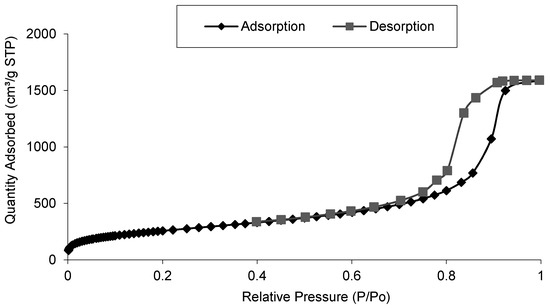 Same samples were analysed to determine the surface area and pore volume depending on catalyst load. Both properties were calculated from N2 isotherm adsorption—desorption curve, that showed for all the samples a type IV isotherm curve that is usual for mesoporous silica aerogels [24] (Figure 7). Almost no differences were found when 7.0% and 10.0% catalyst were loaded in the aerogel.