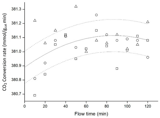 Figure 8 showed that preheating of gases had almost no influence on the CO2 conversion rate and the results were almost constant. This caused proximity between the data points, and thus error bars were excluded. However, the gases flow control system did not allow to avoid preheating. Flow controllers could not stabilize perfectly flows when the gases were cold, and they worked much better with a small heating. For this reason, it was decided to work always at 50 °C for the next experiments.