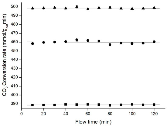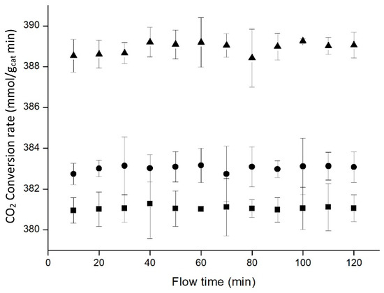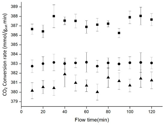 For these experiments, the CO2 flow was kept constant at the lowest controllable rate in our system (0.25 mL/min). Figure 10 indicated that increasing hydrogen proportion was not translated into a clear improvement for the process. In order to achieve 4:1 H2 to CO2 proportion, H2 flow remained constant at 1 mL/min, and CO2 flow was adjusted to 0.25 mL/min.