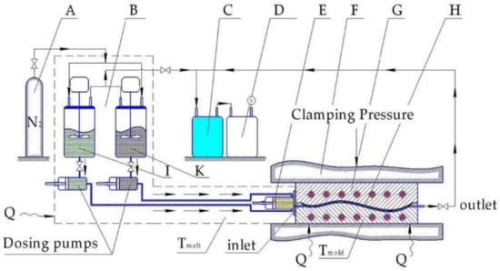Scheme of the T-RTM process (A—nitrogen source; B—dosing unit; C—cold trap; D—vacuum pump; E—dynamic mixing head; F—mold carrier; G—metal mold; H—textile preform; I—tank with ε-caprolactam + initiator; K—tank with ε-caprolactam + activator [8].