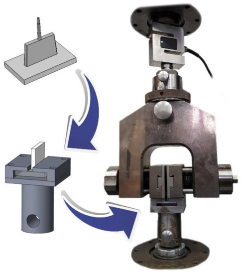 The tensile tests were performed on a Zwick Z005 universal testing machine (Zwick Roell AG, Ulm, Germany) equipped with a special grip that we designed (Figure 3) to test the debonding force of the ribs. All tests were executed at room temperature and at a relative humidity of 50%. Five specimens were tested for each measurement and a 5 mm/min travel speed was used for the experiments.
