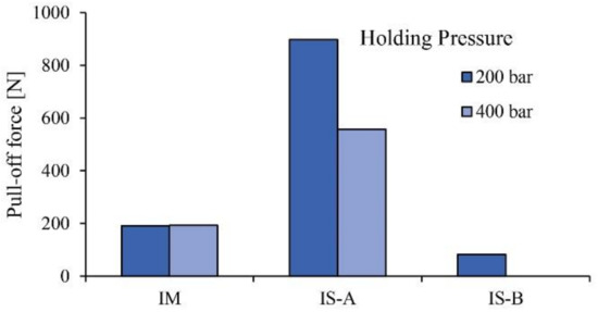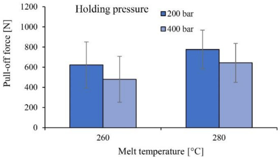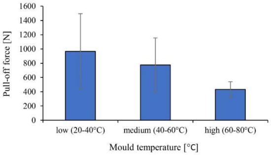 Although we used an aluminum prototype mold without a cooling system, the approximate mold temperature was controlled externally between the cycles, then the temperature was measured with a thermal imaging camera right after the cycle. The low mold temperature was about 20–40 °C, the medium temperature was 40–60 °C, while the high temperature was 60–80 °C. With increasing mold temperature, the possible monomer content of the surface of the plates increase, thus the pull-off forces decrease accordingly. Also, standard deviation decreases as mold temperature increases because the possible monomer content on the surface more uniformly decreases the binding force (Figure 9).