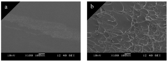 Scanning electron microscopy tests (100 × magnification): (a) non-welded; (b) welded areas.