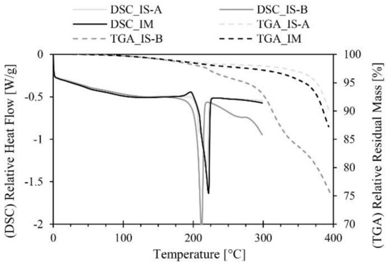 As can be seen in Figure 7, the mechanical properties of the IS-B material (Brüggemann AP-NYLON-based in situ polymerization plate with 3% catalyst and 3% activator) are extremely weak. This phenomenon is a consequence of the degradation (depolymerization) of the material over its melting temperature, as can be seen in Figure 8 in the TGA results. Contrary to the two consumer materials (IS-A, IM), the material we produced does not contain a stabilizer, thus significant degradation occurred over its melting temperature.