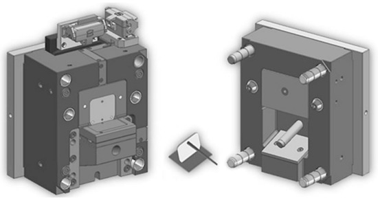 Kisslinger et al. [15] designed an injection mold which had an insert that could be moved when the mold was closed, and had it manufactured. With this mold, they produced specimens with which they examined the bonding strength between various materials. After the first component was injected and solidified, the inserts were pulled back while the mold was still closed, and in the space thus freed up, the second component was injected, whose melt front reached the cooled surface of the first component. The authors claimed that the interphase of overmolded parts can be characterized by Computed Tomography (CT) and Raman spectroscopy effectively, which they performed, but they came to their conclusions after testing only one pair of materials with each method without trying other methods.