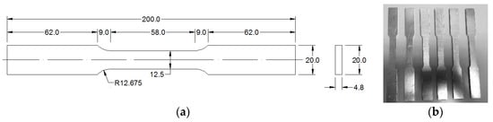 (a) The dimensions of tensile specimens (unit: mm) and (b) sample set.