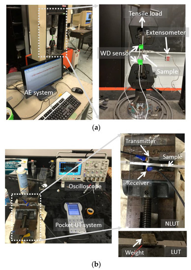 The experimental setups; (a) tensile test and acoustic emission (AE) setup and (b) ultrasonic testing (UT) measurements including linear ultrasonics (LUT) and nonlinear ultrasonics (NLUT).