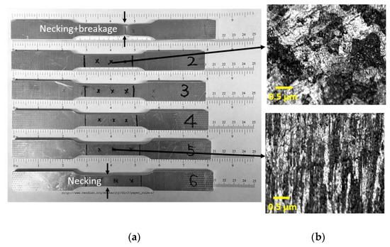 The sample profiles after tensile tests are shown in Figure 3. As mentioned above, the S1 was tested up to failure. The necking occurred before fracture, and the obvious necking was observed in S6 (14% strain); however, there was no necking in S5 (10% stain). It indicates that the necking starts in the strain level ranged from 10% to 14%. Thus, the UTS strain was adjusted as 12%. In addition, the yield strength, ultimate tensile strength, and modulus of elasticity were determined based on the results of S1. The material properties are summarized in Table 1. Figure 4 shows the stress–strain curve of each sample highlighting the stress–strain points that the samples were loaded/unloaded. Good repeatability in stress–strain behavior was observed. The microstructure analyses of two samples (S2 and S5) were conducted. The process follows the standard metallographic procedure [20]. The microscopic images were taken from the middle of the gauge. The microstructure features are shown in Figure 3. During the tensile process, the grain shows dynamic recrystallization behavior. The grain was elongated and reoriented due to increase of strain level. The plastic deformation is mainly attributed to the grain change in the tensile test; in addition, the acoustic nonlinearity is attributed to the grain morphology.