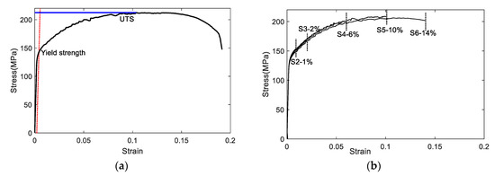 In order to generate the different strain levels, each specimen was loaded up to certain strain level and then unloaded using Instron electromechanical load frame machine as shown in Figure 2a. Elongation was measured by an extensometer over the gauge length of 50 mm. The uniaxial loading was applied at the rate of 0.02 mm/s for S1. The loading rate was adjusted to 0.04 mm/s for S2 to S6 in order to increase the energy release of damage from ductile material and reduce the influence of grip friction. For S1, the sample was loaded up to failure; and strain–stress curve was used to determine yield strength, tensile strength, and the Young’s modulus. The exposed strain levels for S2 to S6 were 1%, 2%, 6%, 10%, and 14%, respectively.