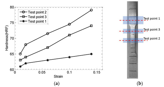 (a) The relationship between strain and hardness (HRF), (b) testing points.
