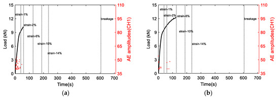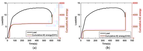 The correlation of load and cumulative AE energy for (a) CH1 and (b) CH2.