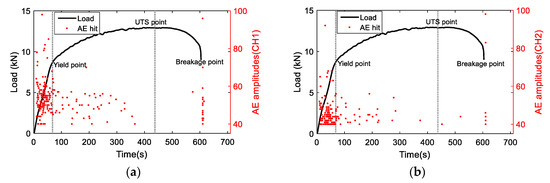 The distribution of AE hits with the loading information is shown in Figure 7. Similar trends as for AE energy are observed. The majority of AE hits are detected in the initial and failure stages. The AE hits at the initial stage may be attributed to dislocation slip or fiction from grip area. The AE hits at the failure stage are due to fracture. As two channels have similar responses, the AE signals obtained from CH1 are further analyzed.