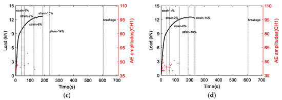 The AE amplitudes with respect to load curve for (a) S3, (b) S4, (c) S5, and (d) S6.