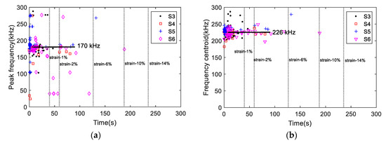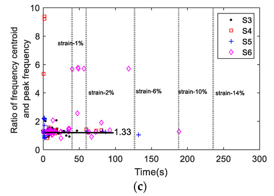The frequency-related AE features (a) peak frequency, (b) frequency centroid, and (c) the ratio of frequency centroid and peak frequency.