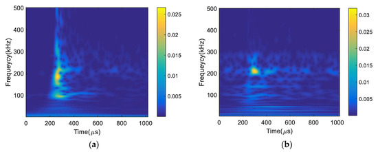 In order to further characterize AE signals from different strain levels, the spectrograms of AE signals are obtained using complex wavelet transform, shown in Figure 11. The AE signal obtained at strain level below 6% has the peak frequency near 200 kHz, similar to fracture energy, in addition to low frequency components. This may be due to the contribution of friction as well as dislocation movement in a single AE signal. Though the AE sources could not be identified directly in this study, similar findings have been obtained in the literature [27,28]. The spectrogram of the AE signal obtained near fracture has high concentration near 200 kHz. It is important to note that the frequency bands highly depend on the AE sensor selected in addition to source mechanism. In general, high frequency components are attributed to the internal microstructure change, such as grain elongation, dislocation, and fracture [25].