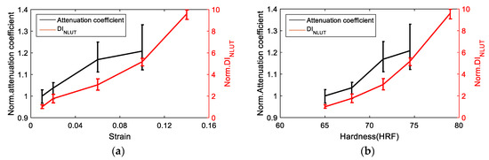 Figure 15a,b shows the correlation of strain level and hardness with ultrasonic attenuation coefficient and nonlinearity, respectively, normalized to pristine sample. LUT attenuation and NLUT acoustic nonlinearity coefficients show similar behaviors with the increase of strain. As shown in the metallographic images of S2 (1% strain) and S5 (10% strain) in Figure 3, the grain distribution changes with plastic deformation, which influences the ultrasonic properties. With increasing strain level, the grain becomes narrowed and elongated. Those microstructural changes are correlated with the ultrasonic properties. However, the errors in linear attenuation coefficient are higher while its sensitivity to plastic deformation is lower than the nonlinearity coefficient, as expected. Therefore, the damage index obtained from NLUT is used in combination with the damage index obtained from AE.