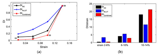 The combined damage index of AE and NLUT measurement is shown in Figure 16a. As shown in this figure, with the increase of plasticity in the material, the DI increases. The rate of material degradation is higher when the material approach to failure. The sensitivity is defined as the ratio of DI and strain, see in Figure 16b. With the increase of damage in the material, the sensitivity of DI increases for three measurements. For the initial stage of testing (0–10%), DINLUT has the highest sensitivity because the NLUT is more sensitive to the microstructure change in the initial stage. DIAE and DIcombined are more sensitive when the material approaches failure.