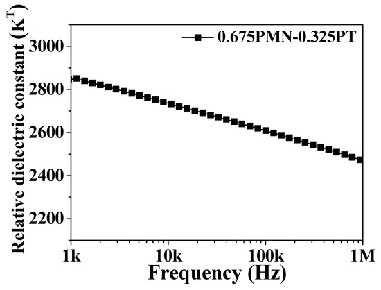 Figure 4 displays the frequency dependent dielectric constant of 0.675PMN-0.325PT ceramics, which were employed in the shock absorber system. The dielectric constant was measured by varying the frequency from 1 kHz to 1 MHz. The dielectric constant decreased from 2847 to 2469 as the frequency increased from 1 kHz to 1 MHz.