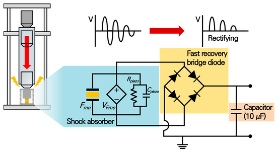 Usually, mechanical shock energy can be applied to the shock absorber system, the forcing time is very short and it is almost impossible to generate or collect the energy. To solve this problem, a piezoelectric energy generator was incorporated with a shock absorber system and the energy storage circuit was attached to maximize the collecting energy. Figure 7 shows the designed energy storage circuit system. A fast recovery diode-based bridge rectification system was suggested to be employed in this research. Since the voltage generation time of piezoelectric energy harvesters without a spring structure is very short, around a sub-microsecond, some amount of energy cannot be collected due to the time lost from the recovery time of the diodes. Therefore, it is very important to employ a fast diode-based full-bridge rectifying system [33]. The voltage generated by the energy harvester was stored in a 10 μF capacitor across the bridge rectification system and the generated energy was derived by measuring the voltage applied to the capacitor.