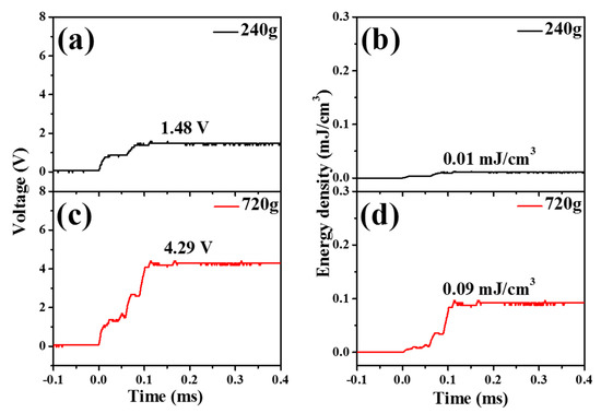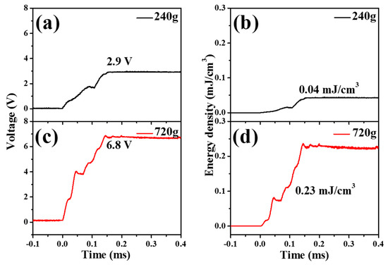 Figure 9a shows the generated voltage by dropping 240 g onto the piezoelectric energy harvesters with a spring structure. The piezoelectric energy harvesters had the same number of layers as piezoelectric plates. Compared with Figure 8, it can be seen that the output voltage and energy were increased by introducing the spring structure. Masses of 240 g and 720 g were dropped on the energy harvester system, which contained piezoelectric materials and an inertial mass. Voltages (2.9 and 6.8 V) were generated from the piezoelectric energy harvesters with a spring structure, which corresponded to 0.04, and 0.23 mJ/cm3 for the droplet for 240 (Figure 9b) and 720 g (Figure 9d), respectively.