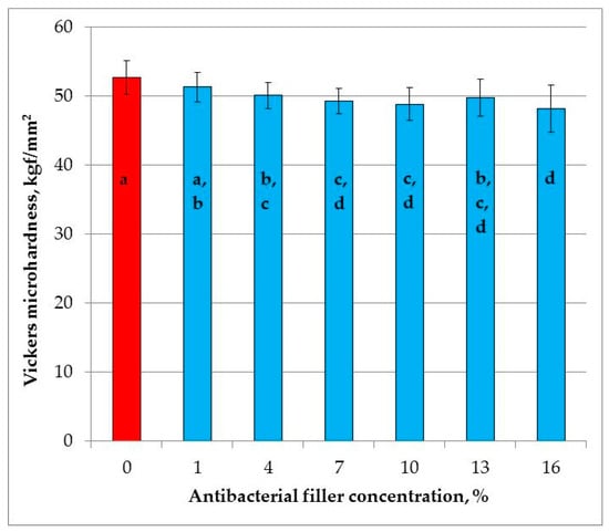 Mean Vickers microhardness values with standard deviations; different lowercase letters show significantly different results at the p < 0.05 level.