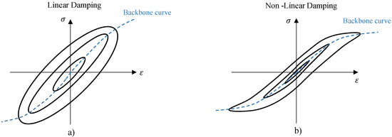 Schematic of a hysteresis cycle for materials with: (a) linear and (b) nonlinear damping.