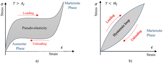 Regardless of the different physical mechanisms involved, all real materials dissipate some level of energy, no matter how little, during cycling deformation. Generally, such effect is highly nonlinear and related to many factors such as temperature, frequency, strain, and strain rate, while the linear behaviour assumption has only a limited application. A plot of instantaneous stress vs instantaneous strain, for all values of time during a steady-state of forced vibration tests, is referred to as a hysteresis cycle and is a well established experimental approach in classifying and quantifying the internal damping behaviour of materials. Metals alloys, as well as severe high damping alloys, show elliptical hysteresis cycles with linear damping, including viscous damping, hysteretic damping, and linear rate depending damping, while the hysteresis cycles show a more sophisticated shape with a nonlinear damping (Figure 1) [16]. In case of SMA materials, frequency and amplitude dependencies of damping dependencies have been reported in many studies [12,17]. The intrinsic amplitude-dependent damping is associated to two different phenomena: pseudo-elasticity and the dissipation of energy in the martensitic state (Figure 2). The former occurs in SMA materials with an austenitic phase at their operating regime, where the stress-induced martensite will generate the pseudo-elastic behaviour of the material, while the latter occurs in the SMAs with a martensitic microstructure at operating regime. The high damping values reported in this case were ascribed to the high density of mobile twins and mobile interfaces [10].