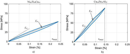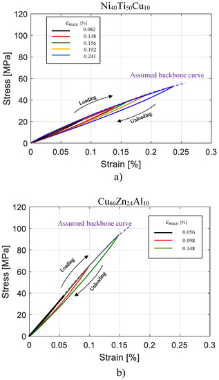 The parameters of the modified Masing model (Equation (4)) were identified through the experimental reference hysteresis cycles presented in Figure 6 which corresponds to the largest cycles in Figure 3, for Ni40Ti50Cu10 and Cu66Zn24Al10, respectively, and are reported in Table 2.
