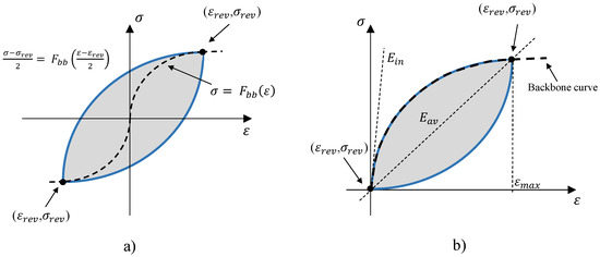 where the parameters represent, respectively, the average elastic modulus, the initial elastic modulus, and the maximum strain (See Figure 4b) of the hysteresis cycle available with the highest amplitude, which hereafter is mentioned as hysteresis of reference. The proposed function guarantees lens shaped cycle as observed in the cyclic tensile tests for the materials investigated (Figure 3). For a fixed higher value of would result in larger hysteresis cycles and a consequent higher damping value. Considering Equation (4) as the hysteresis function, the elastic modulus of the material for each strain increment would be equal to: