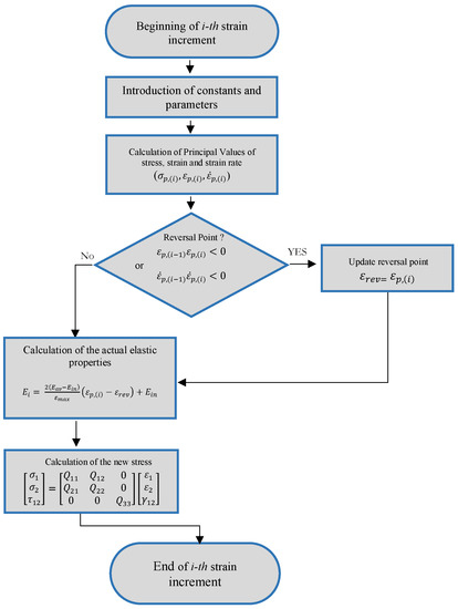 - The actual elastic properties for each strain increment, were calculated according to Equation (5), based on the principal strain with highest absolute value () and the last reversal strain (). The actual principal strain is calculated from the strain values in standard direction () at the beginning of the increment.