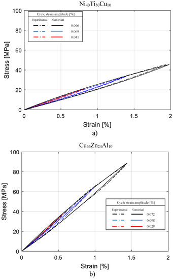 For each composition, the validity of the developed model was proven by comparing the numerical hysteresis loops with additional experimental hysteresis cycles at different amplitudes. The numerical cycles were obtained by simulating, with a plain stress FE model of the specimen, the same condition of experimental cyclic tensile tests explained in the previous section devoted to Materials. The comparison between the experimental and numerical hysteresis loops is reported in Figure 7a for tests on Ni40Ti50Cu10, and in Figure 7b for tests on Cu66Zn24Al10. Three experimental and numerical cycles are represented in each case for comparison. By definition, amplitude of cycle is considered equal to half of maximum stain level of the cycle. A good agreement between the numerical and experimental results is observed. For more comparison, the corresponding loss factor and average elastic modulus of both numerically and experimentally obtained cycles, were calculated and compared. The loss factor corresponding to the hysteresis cycle is given by: