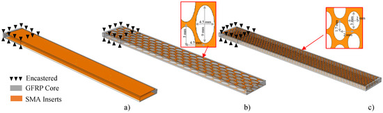 The architecture of the hybrid structures is shown in Figure 8. The core composite is a symmetric angle-ply laminated of fiberglass/epoxy resin (3M-SP250 S29A) [+45/−45]18 which corresponds to 36 plies with angles of +45 and −45 in alternating sequences. Two layers of SMA alloys can be identified, each 0.2 mm thick, inserted in the matrix glass fiber under the upper and bottom surfaces of the hybrid cantilever beam. Plain and geometrically patterned layers with different dimensions were used, optimized to avoid the delamination of the hybrid composite [41]. Figure 8a shows the hybrid composite with the plain SMA layer, while Figure 8b,c shows the patterned layers with large and small holes respectively. Beside the hybrid layups, the original non-hybrid layup was investigated as a reference in order to compare damping improvements. The original layup is made only from GFRP [+45/−45]22 in which SMA sheets are replaced by two plies of GFRP to obtain an almost equivalent thickness. Seven different layups were taken into consideration, as summarized in Table 5. For numerical simulations, seven different layups were reproduced in the Abaqus FE model. The GFRP composite was modelled using 20 node brick elements with a reduced integration. For the hybrid geometry, the thin SMA sheets were modelled with eight node shell elements on the top and bottom surface of the GFRP core. The constraint between the upper and lower surface of the GFRP laminated composite and the thin SMA sheet is a tie constraint. This constraint makes the motion of each node of the SMA sheet equal to the motion of the closest node on the GFRP reference surface. The beam was clamped at one end.