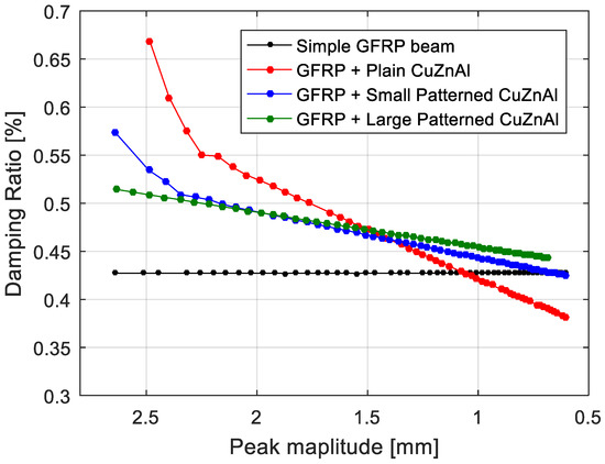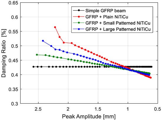 In the Ni40Ti50Cu10 hybrid beams (Figure 10), it was observed that the damping improvement was more effective at higher amplitudes. This is aligned with the assumption of an amplitude-dependent damping defined for SMA materials. The highest improvement was observed when using the plain sheet. In this case, the rate of the damping ratio change is also higher than the rate observed when a patterned sheet is used, but the drawback of this layup is given by the delamination. For all of the different layups, at a certain point (amplitude less than 1 mm), hybrid structures exhibited lower damping values compared to the simple GFRP beam. This is due to the fact that, Ni40Ti50Cu10 offers a lower damping capacity at low amplitude vibration compared to the GFRP core material.
