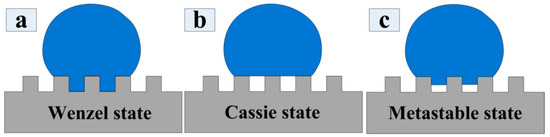 The wettability of the surface is divided into hydrophobic and hydrophilic properties, which are studied by the surface contact angle (CA). That is, the surface with a CA higher than 90° is a hydrophobic surface. Furthermore, the surface that satisfies the condition of a CA above 150° and a rolling angle of less than 5° is called a superhydrophobic surface. The infiltration state of a water droplet on the solid surface is generally divided into three categories, the Wenzel state, the Cassie–Baxter state, and the metastable state [4,5]. The diagram of the infiltration state is shown in Figure 1. Among those wetting states, the Cassie–Baxter state is more suitable for the study of the hydrophobic textured surface [6].