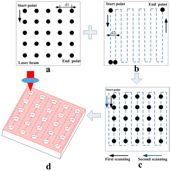 Schematic diagrams of the micro/nanostructure prepared by laser treatment on the Ti-6Al-4V surface. The scanning paths: (a) the micro-dimple array; (b) the LIPSS ripple; (c) hierarchical structure; (d) the 3D schematic diagram of a laser textured hierarchical structure.