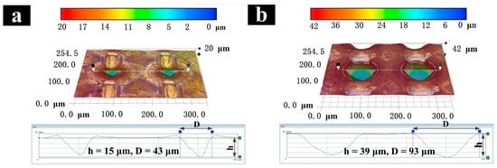 The single micro-dimple morphology is shown in Figure 3. Figure 3a,b represent different micro-dimple obtained under two typical parameters, respectively. By comparing the 2D and 3D morphology of the micro-dimple, it can be observed that the smaller defocus amount corresponds to a small micro-dimple diameter, and the larger pulse number corresponds to a larger depth. In order to obtain micro-dimple of accurate size, it is necessary to study the effects of the pulse number and the defocus amount on the depth of the micro-dimple.