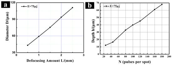 The relationship of the irradiation parameters with the desired geometry. (a) Diameter vs. the defocusing amount; (b) depth vs. the pulses per spot.