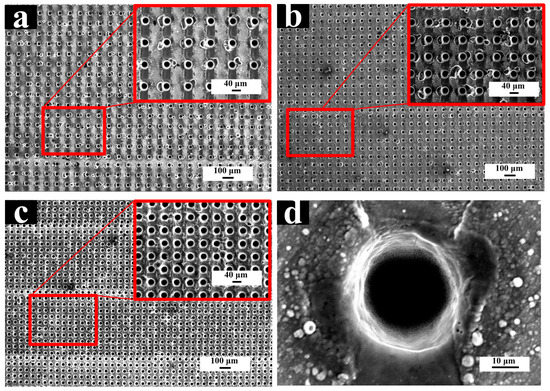 The different areal densities of the micro-dimple array are prepared by adjusting the pitch of adjacent action spots, which is shown in Figure 5. The micro-dimple diameter is 40 μm, and the pitch is set to 100, 80, and 60 μm, which is corresponding to areal densities with 13, 20, and 35%, respectively. The micro-dimple array was observed and characterized by scanning electron microscopy and Figure 4 is a corresponding electron microscope image. It can be observed in Figure 4d that the surfaces of the micro-dimple and its peripheral regions are free of splashing of molten residue. Then the smooth and accurate micro-dimple is obtained, which meets the expected requirements.